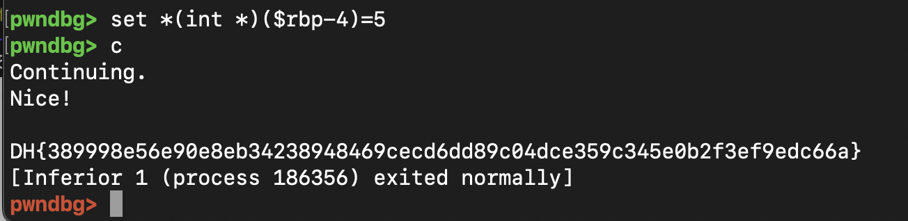 set *(int *)($rbp-4)=5 명령어를 통해 해당 값을 5로 수정해주면