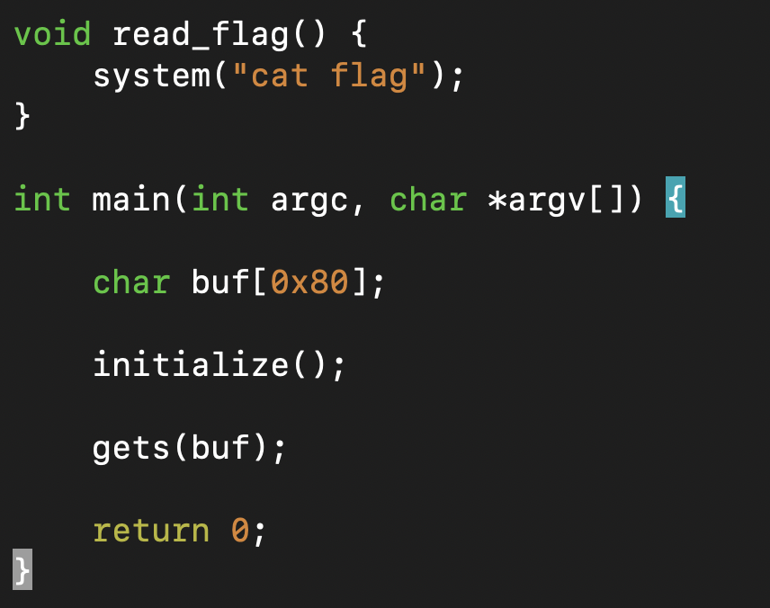 해당 파일의 코드를 보면 read_flag라는 함수에서 cat을 이용하여 flag를 읽고 있는 것을 확인 할 수 있다. 또한 buf라는 버퍼에는 0x80만큼의 공간이 있다. 따라서 우리는 read_flag 함수의 주소를 찾아서 bof를 진행하면 flag를 획득할 수 있을 것이다.