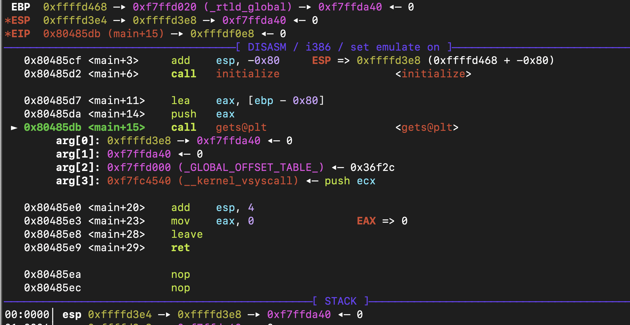 사용자 입력을 받는 gets 함수에 bp를 걸고 프로그램을 실행시켜 보면 위와 같은 결과를 통해 스택 프레임 구조를 파악할 수 있다.