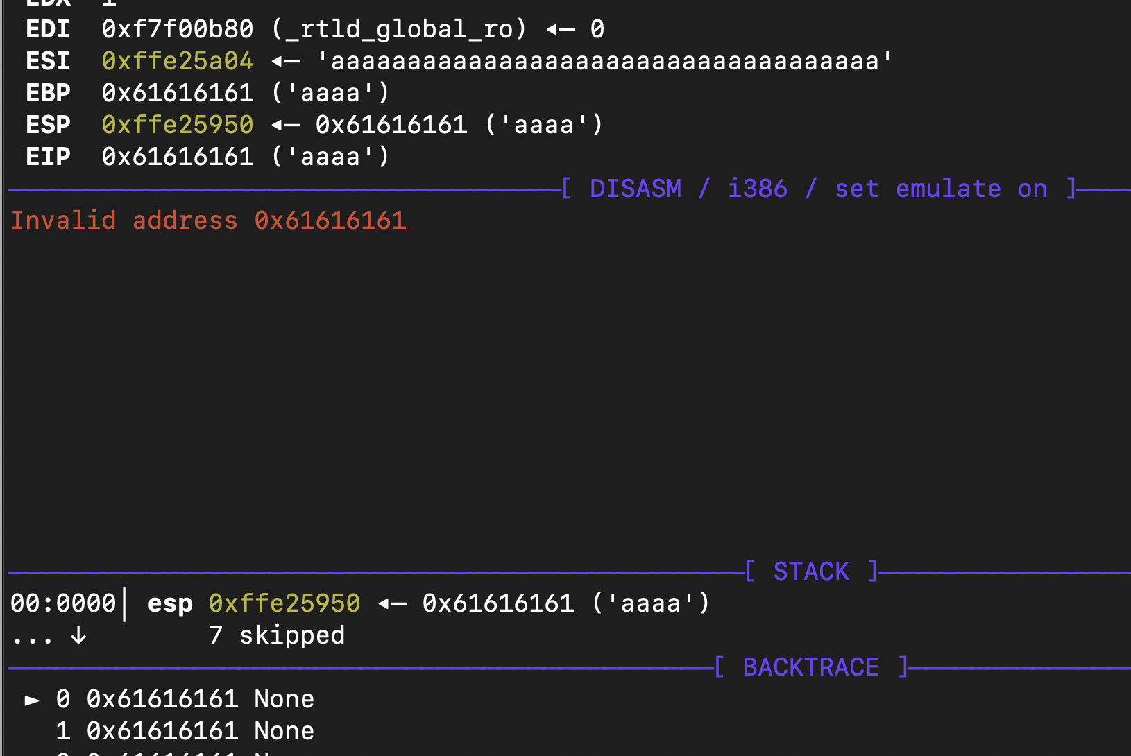 core 파일을 gdb로 분석해보면 0x61616161에서 violation이 발생하였다. 그리고 esp에 우리가 입력한 aaa의 값의 일부인 aaa가 저장되어 있는 것을 확인 할 수 있다. 따라서 너무 많은 값을 입력하여 반환 주소를 aaa가 덮어쓴 것이다.