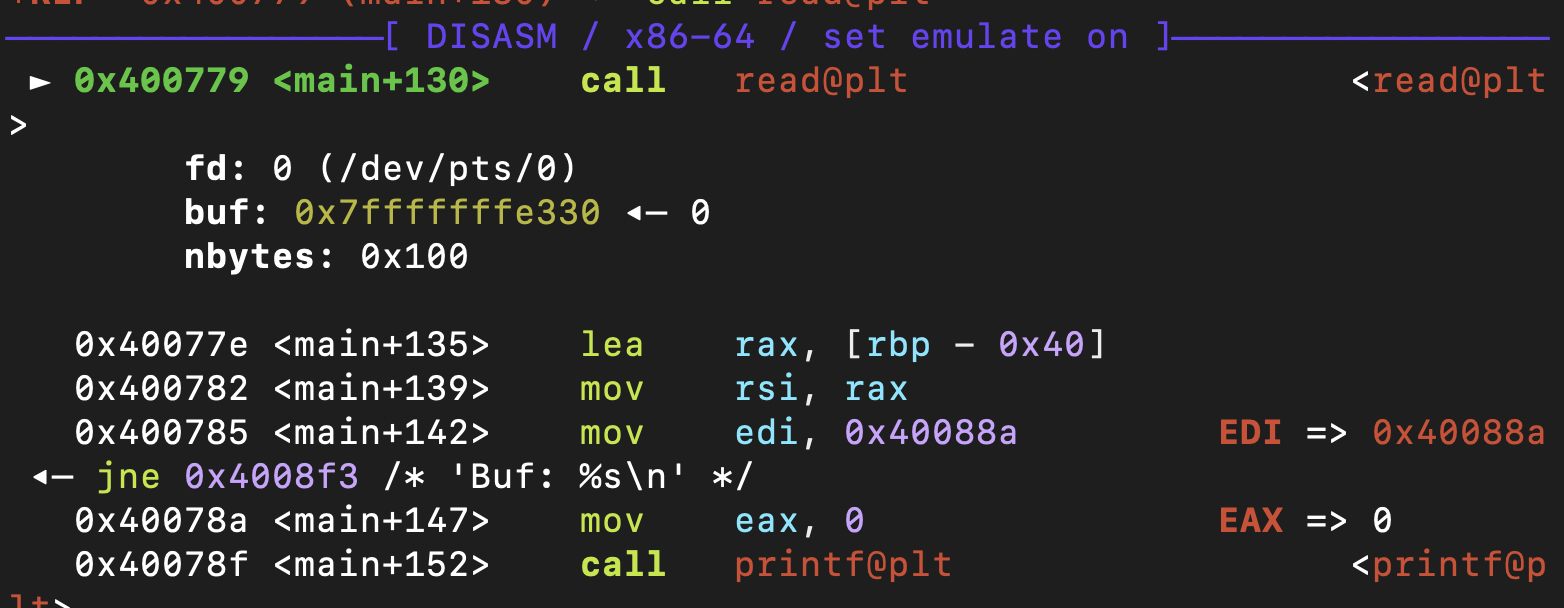 이렇게 rop 바이너리를 gdb로 disassemble하면 buf의 주소가 rbp-0x40이라는 것을 확인할 수 있다. 따라서 해당 바이너리 스택 프레임은