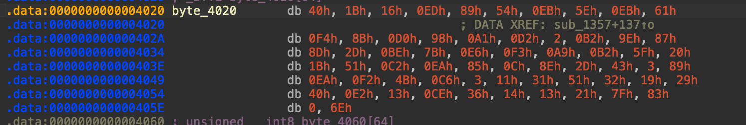 따라서 byte_40E0 에는 위와 같은 값들이 들어있다는 것을 알 수 있다.