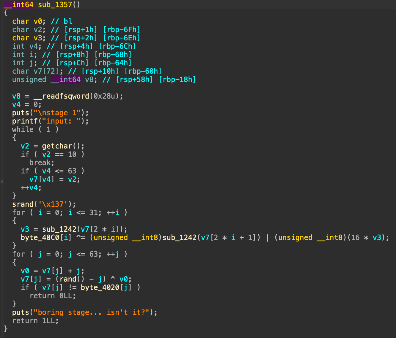 6. 만약 v7의 값이 byte_4020의 값과 다르면 0을 반환, 다른 경우에는 boring stage... isn't it? 문구 출력하고 1 반환