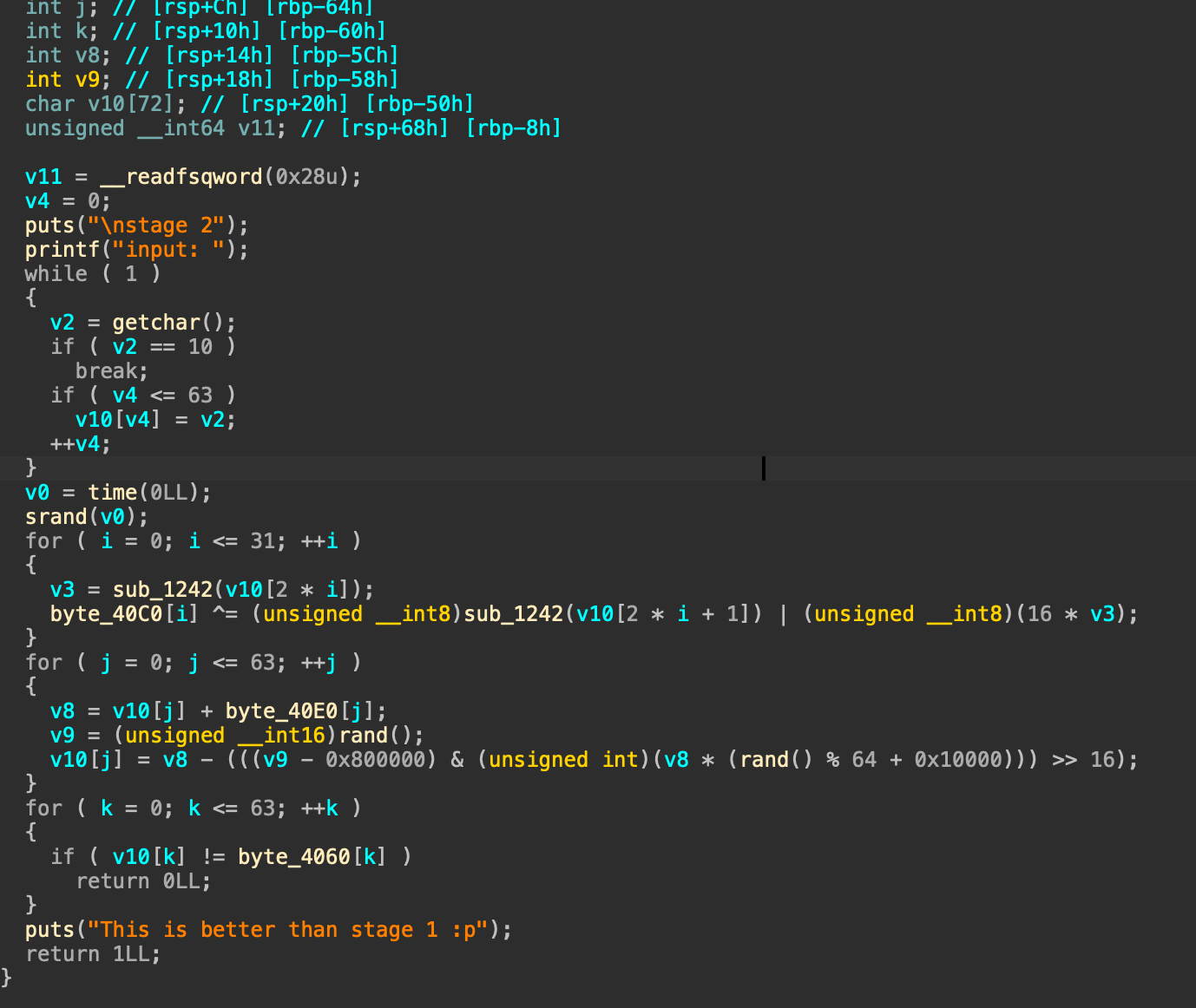 6. 만약 v10의 값이 byte_4060과 다르면 0을 반환하고 같다면 "This is better than stage 1 :p" 라는 문구를 출력하고 1을 반환한다.