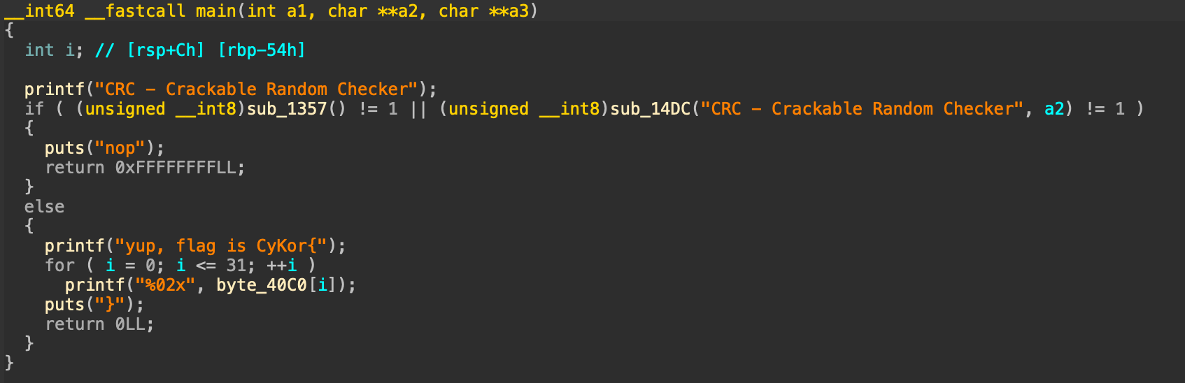 위의 코드를 살펴보면 sub_1357() 함수의 반환값이 1이 아니거나 sub_14DC 함수의 반환값이 1이 아니면 nop이라는 문구를 출력한다. 그리고 다른 경우에는 flag를 출력하는 것을 알 수 있다. 따라서 해당 함수들이 1을 반환해야 한다는 것을 알 수 있다.