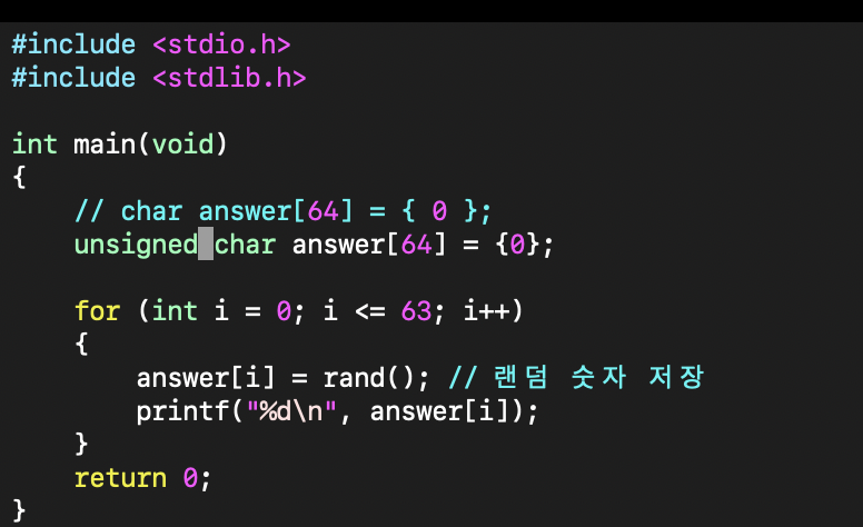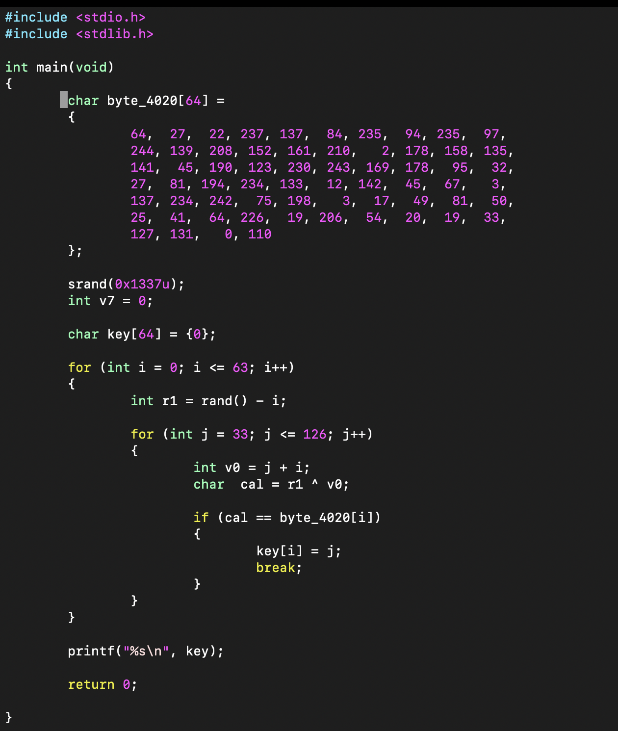 위의 코드를 보면 byte_40E0 배열에 랜덤한 값을 저장하는 것을 알 수 있다. 따라서 한번 그대로 작성해서 컴파일 해보자.