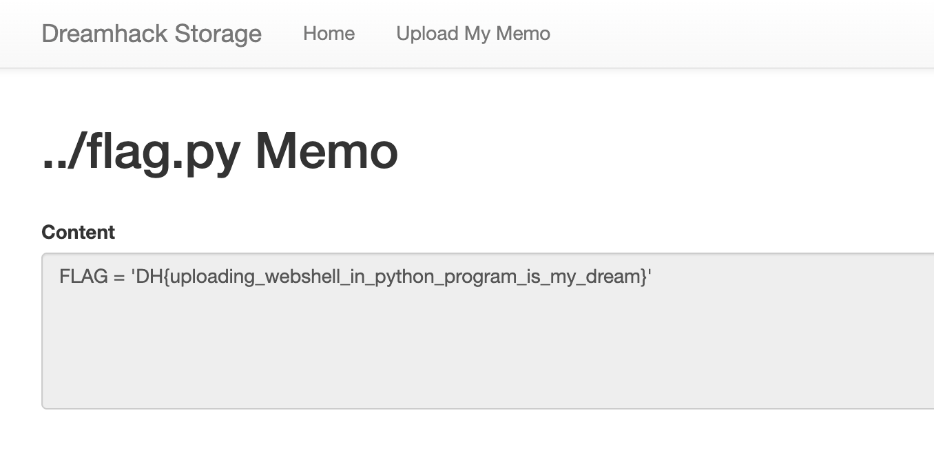 따라서 파일을 업로드 할 때만 필터링을 적용하고 파일을 다운로드 하여 열람할 때는 필터링이 없기에 url에서 filename을 ../flag.py로 바꿔주면 flag 획득이 가능할 것으로 보인다.