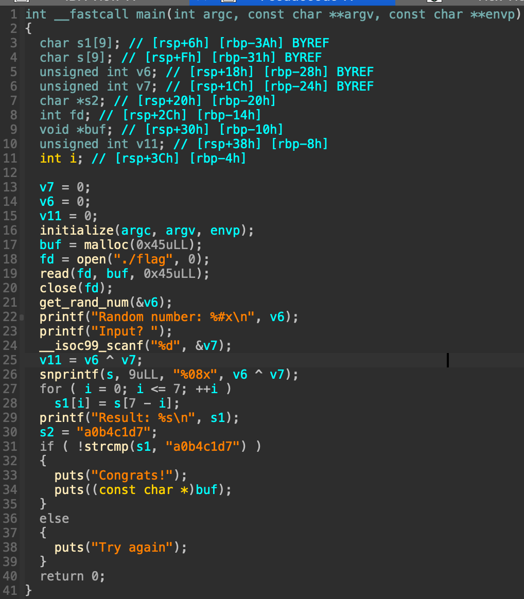 해당 문제를 다운받고 바이너리를 실행하면 random number을 출력하고 input?이라는 문구와 함께 입력란이 나온다. 아무거나 입력해보면 result라는 문구가 출력되고 특정한 문자가 출력되며 try again이라고 출력된다. 따라서 알맞는 입력값을 찾는 것이 이 문제의 목표인것 같다.