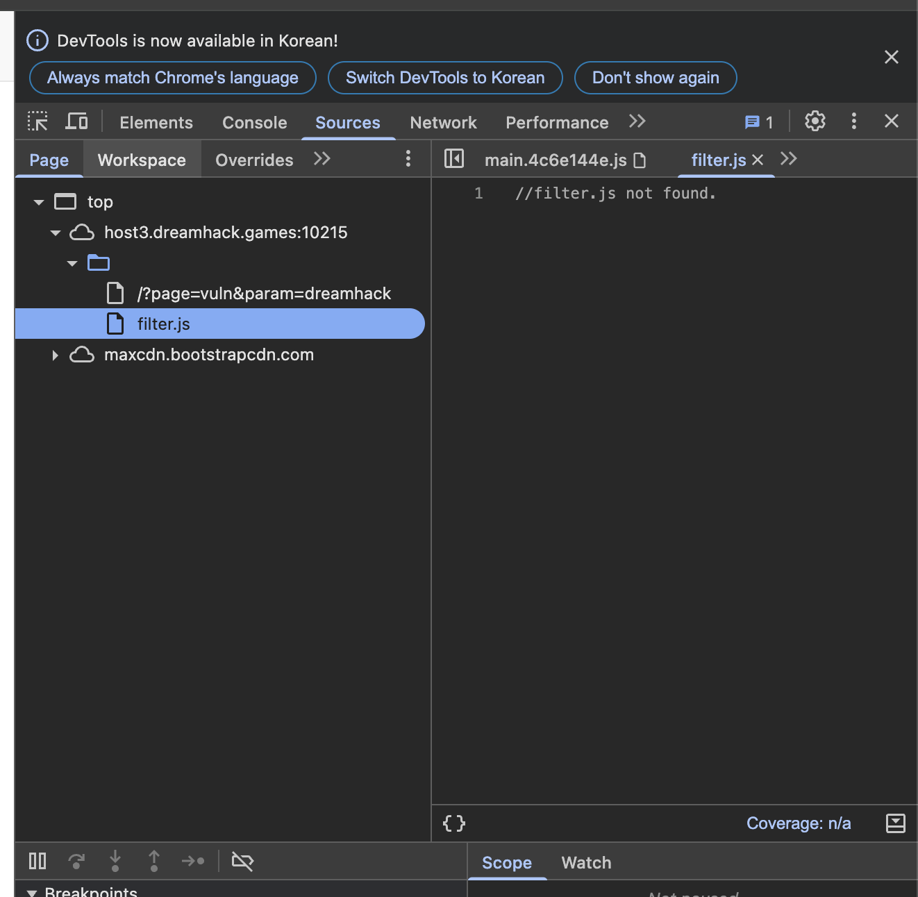 이렇게 vuln 페이지에 접속하면 404.php에 의해 /filter.js not found라는 문구가 출력되는 것을 볼 수 있다. 따라서 현재 vuln 페이지에서 filter.js의 경로를 /filter.js로 지정하고 있기 때문에 filter.js가 vuln페이지에서 불러와지지 않는 것이다. 이에 따라 404.php가 로드되어 filter.js가 덮어씌워졌다.
