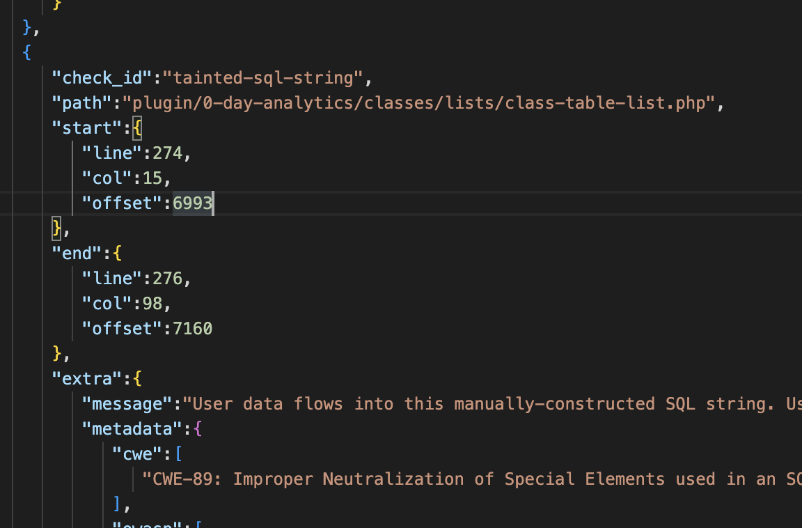 이제 rule까지 정해줬으니 파이썬으로 plugin 디렉터리에 저장되어 있는 모든 파일을 semgrep으로 검사하도록 코드를 작성하고 실행해보았다. 나는 semgrep이 취약점을 발견하면 해당 코드들을 Json 파일로 저장하게 만들어두었다. 그렇기 때문에 코드 실행이 끝난 후에 저장된 json 파일을 보면서 코드를 하나하나 찾아보며 audit을 진행하였다.