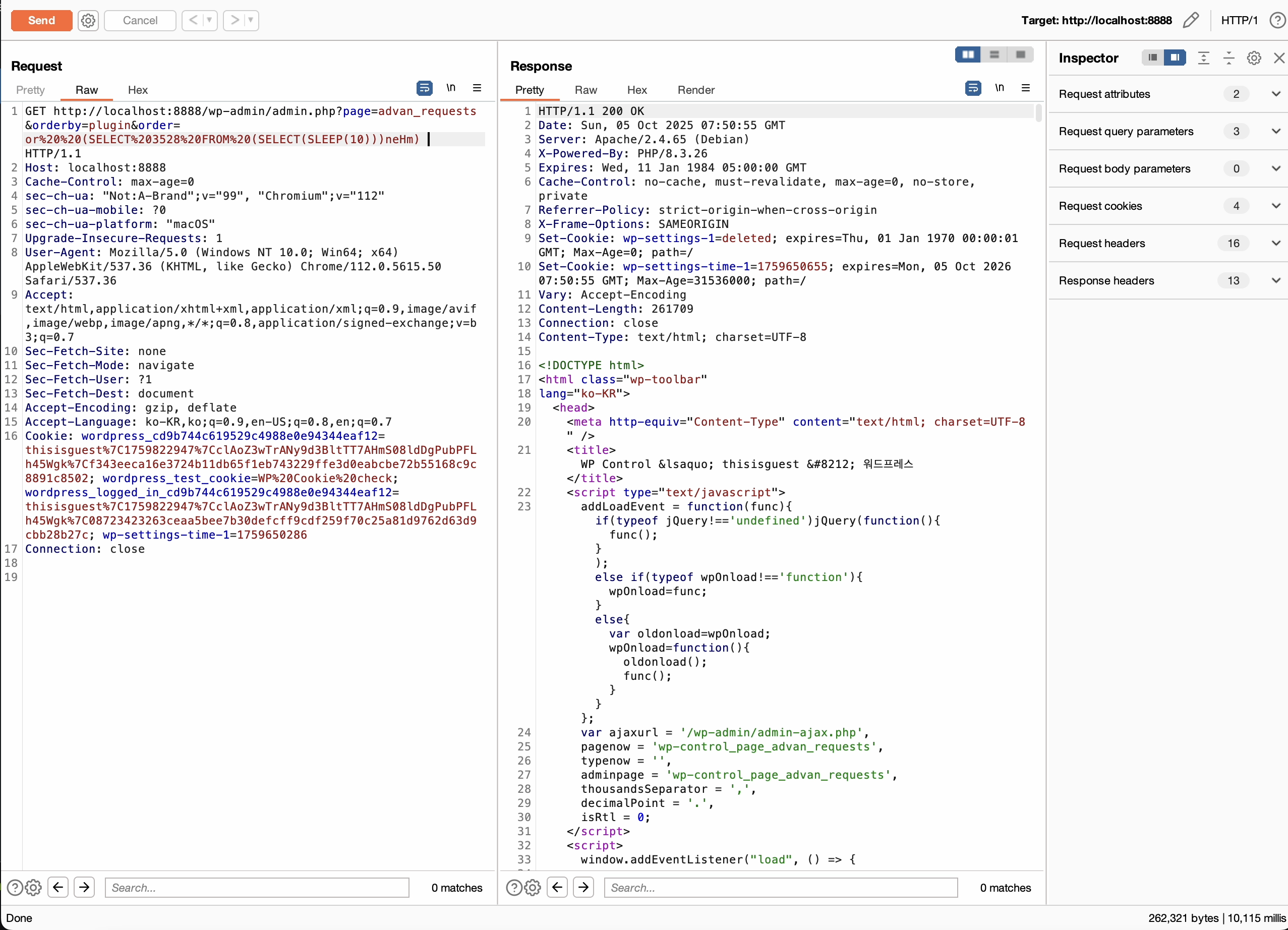 class-table-list.php에 들어가서 직접 코드를 보니 딱봐도 취약해보인다. 코드에서는 sqli를 막기 위해 파라미터에 esc_sql 함수를 사용했지만 해당 함수는 sqli를 막기엔 충분하지 않다. $orderby, $order 둘다 sqli에 대한 필터링이 충분하지 않기 때문에 두개의 파라미터에서 모두 취약점이 터질 것이다. 따라서 바로 로컬에서 wp-admin에 접속하여 플러그인을 추가하고 재현을 해보았다.