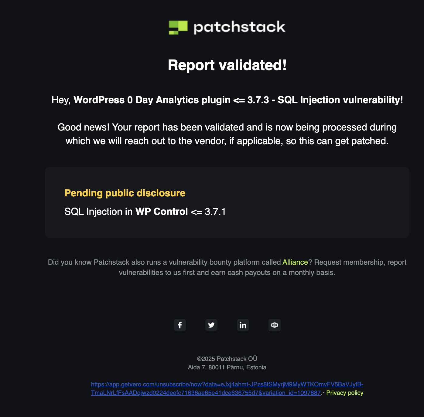 해당 취약점을 발견하고 나는 바로 patchstack에 제보했고, patchstack 측에서 해당 플러그인에 sqli가 있었다는 이메일까지 받았다.