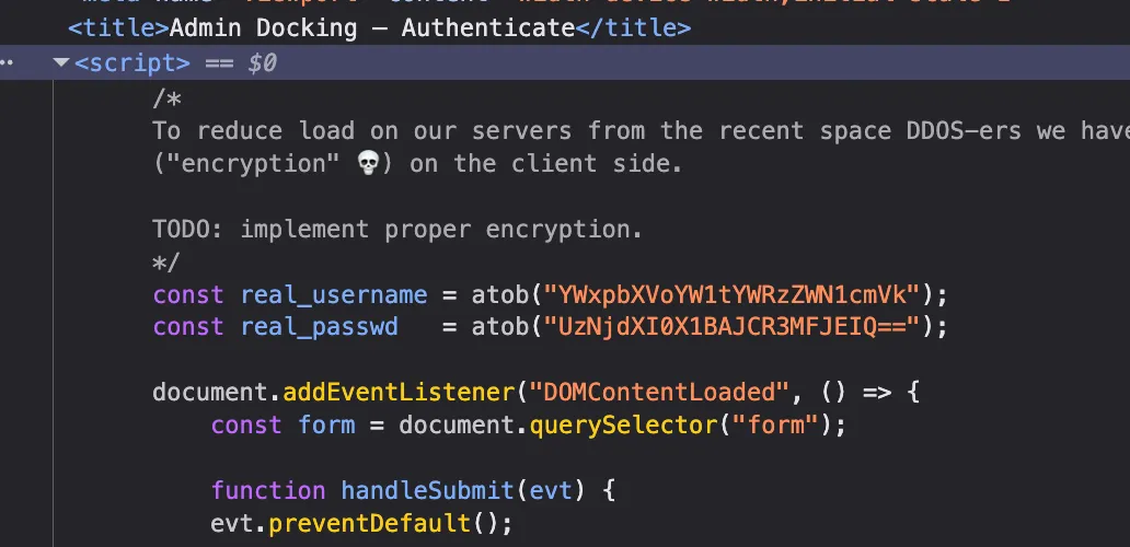 /admin 엔드포인트에 접근해서 개발자 도구로 자바스크립트 코드를 확인해보면 위와 같이 base64로 인코딩된 username/pw를 알 수 있다.
