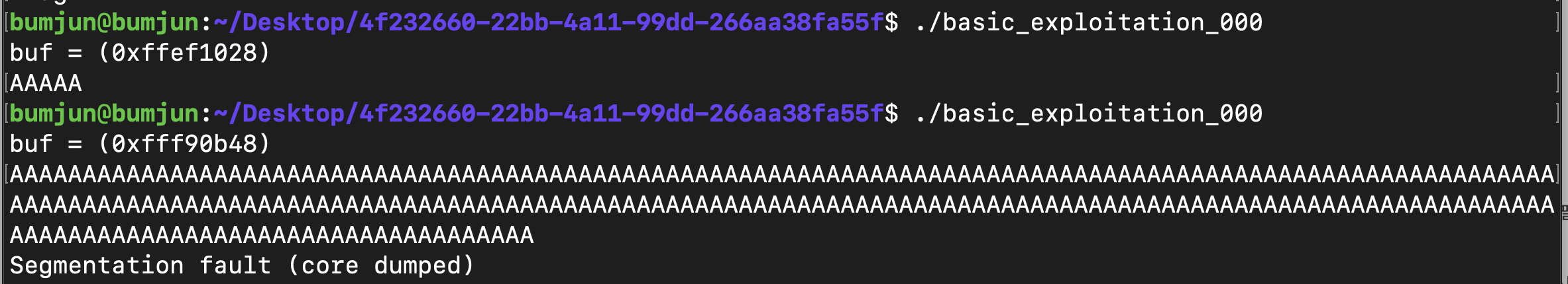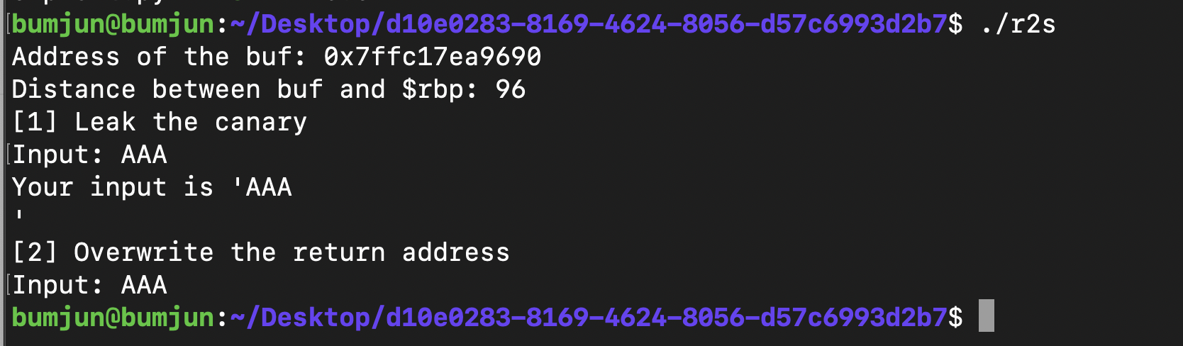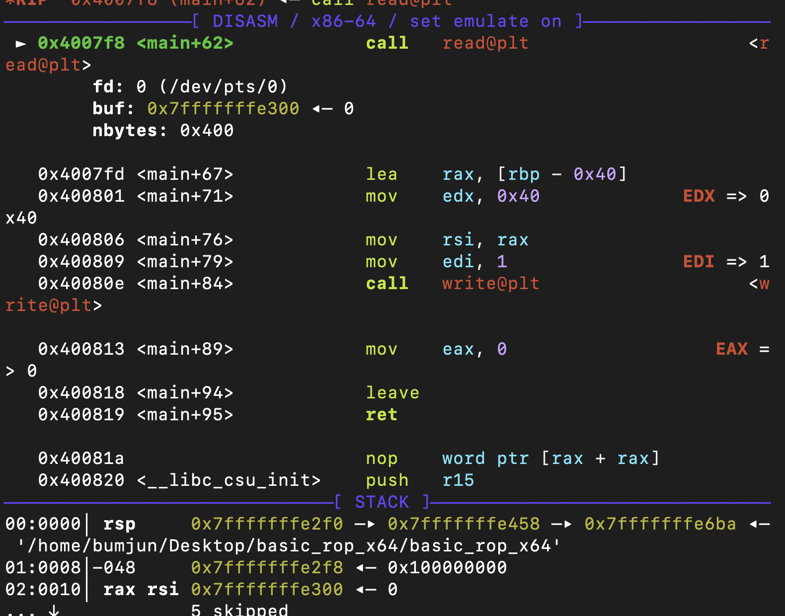 문제 분석checksec으로 해당 바이너리에 어떤 보호기법이 적용 되어 있는지 확인해보면 NX와 ASLR이 적용되어 있다. 하지만 카나리는 적용 되어 있지 않다.GDB 분석main 함수를 disassemble 해보면 buf 함수가 ebp-0x44에 저장되어 있는 것을 확인할수 있다. 따라서 0x04 크기의 더미값이 스택에 있다는 뜻이다. 위의 정보를 토대로 스택 프레임 구조를 파악해보면 buf(0x40)dummy(0x04)sfp(0x04)ret(0x04)라는 것을 알 수 있다. 익스플로잇 설계해당 바이너를 익스플로잇 하기 위해 우리는 저번 문제에서 사용하였음 ret2main 기법을 사용해 공격을 진행할 것이다. from pwn import *p = remote('host3.dreamhack.games'..