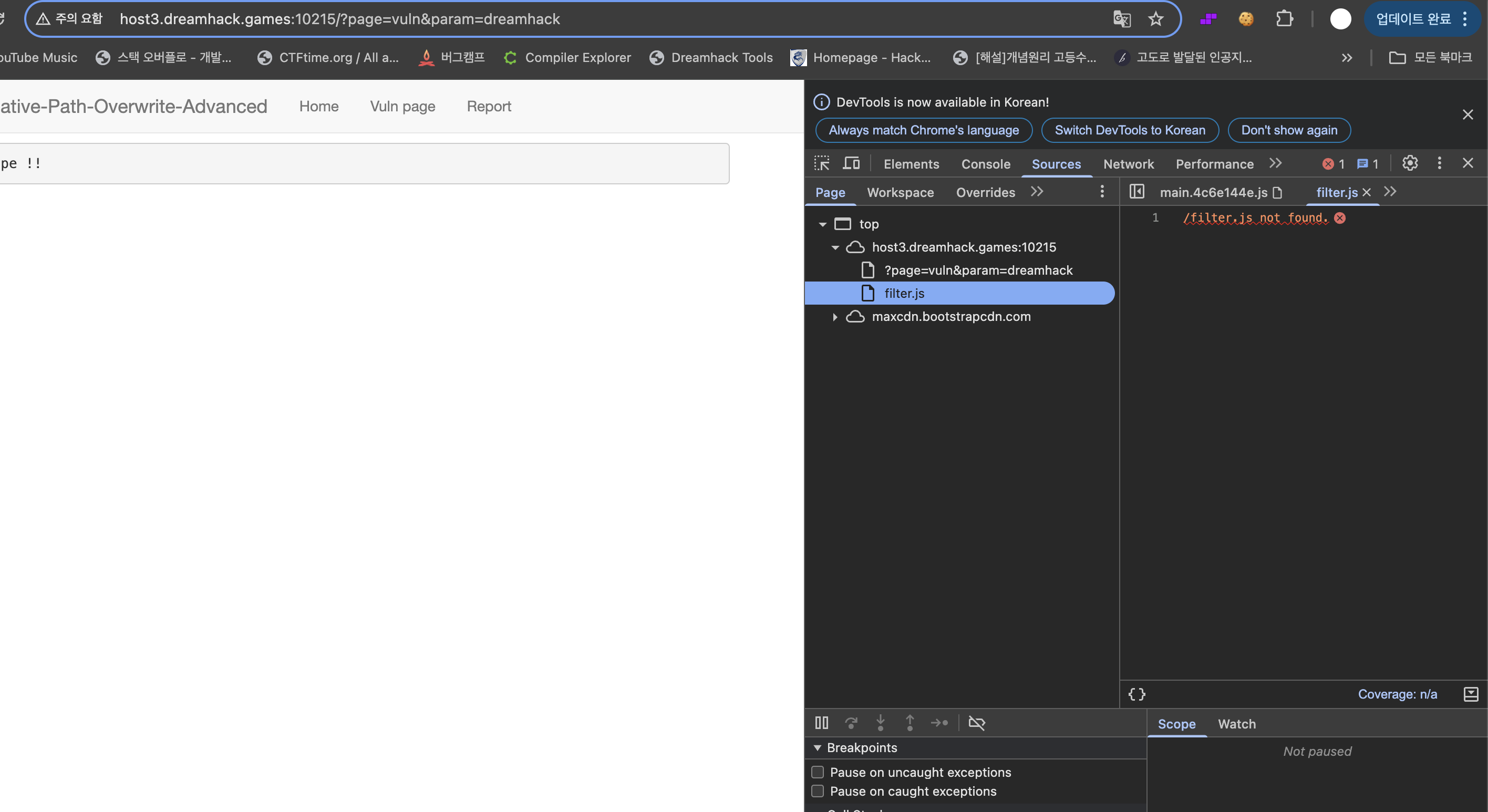 index.php, vuln.php, main.php, report.php 등 거의 모든 코드들이 이전 문제와 유사하다.하지만 이 문제의 차이점은 404.php 파일과 filter.js가 static 폴더에 저장된다는 점이다. 이렇게 vuln 페이지에 접속하면 404.php에 의해 /filter.js not found라는 문구가 출력되는 것을 볼 수 있다. 따라서 현재 vuln 페이지에서 filter.js의 경로를 /filter.js로 지정하고 있기 때문에 filter.js가 vuln페이지에서 불러와지지 않는 것이다. 이에 따라 404.php가 로드되어 filter.js가 덮어씌워졌다. 따라서 우리는 404.php를 이용해 filter.js를 덮어쓸 것이다.url에 /를 하나만 더 추가해주면 filter..
