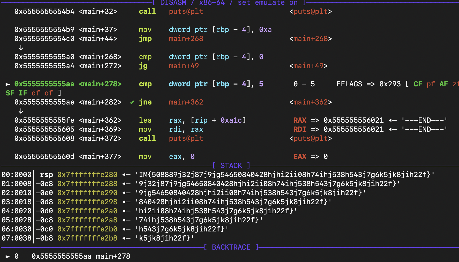 일단 cmp [rbp+var4], 5가 있는 주소로 이동해야 한다.