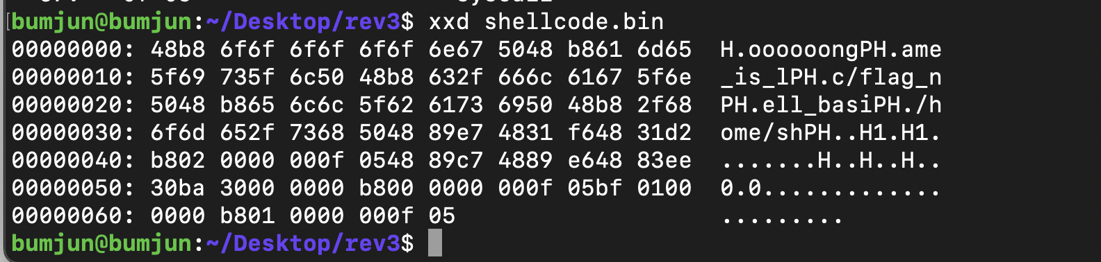 따라서 xxd shellcode.bin을 통해 해당 파일을 확인해보면