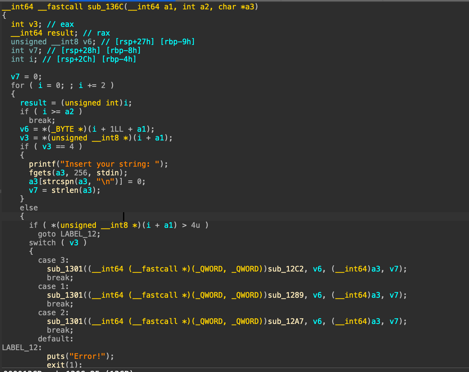 위의 함수는 만약 v3가 4라면 사용자 입력을 받고, 그게 아니라면 라벨12로 가거나 case3, case1, case2를 실행한다.