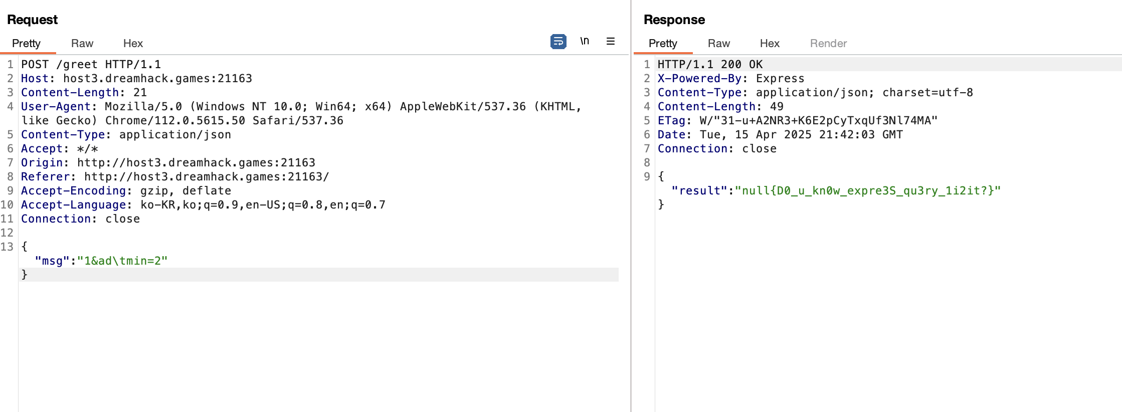 msg : 1&ad\tmin=2라는 페이로드를 삽입해주면 오른쪽의 Response에 보이는 것과 같이 flag가 출력된 것을 확인할 수 있다.